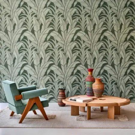 Kies voor prints met bladmotieven, geweven texturen of ton-sur-ton patronen in groene en beige tinten. Zo breng je een natuurlijke flow in je interieur zonder het te overbelasten.